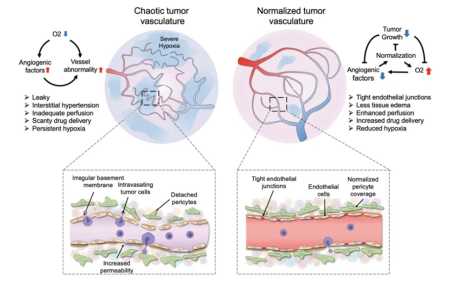 紊亂的腫瘤血管結(jié)構(gòu)伴有滲漏的血管,導(dǎo)致高間質(zhì)壓力、低氧環(huán)境和供血不足,從而影響藥物的輸送。通過抑制血管生成的方法,可以去除不成熟的腫瘤血管,從而形成看起來更正常、供血更充足的血管結(jié)構(gòu)。這樣,抑制血管生成有助于改善化療藥物的滲透效果。