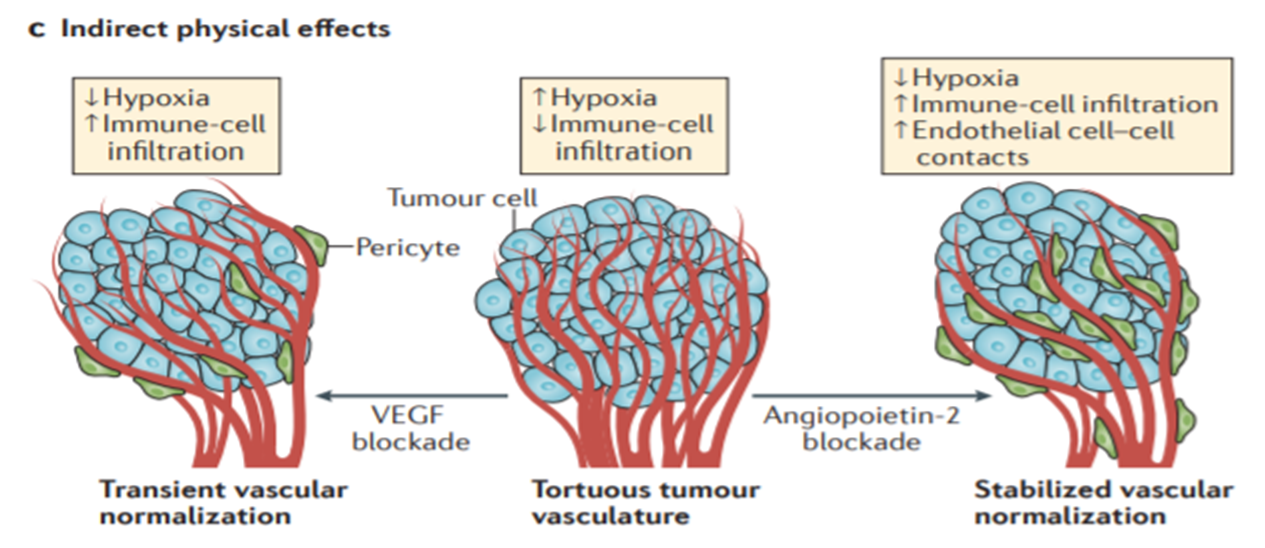 VEGF可以增加調(diào)節(jié)性T細(xì)胞增殖和向腫瘤組織的回歸。VEGF還可以抑制樹突狀細(xì)胞成熟和CD8+T細(xì)胞的增殖和功能,并導(dǎo)致T細(xì)胞衰竭。血管生成素2(Angiopoietin 2)可與巨細(xì)胞和單核細(xì)胞結(jié)合,導(dǎo)致免疫抑制。HGF和PDGFAB可以與樹突狀細(xì)胞結(jié)合,從而抑制它們的成熟。HGF還可以與T細(xì)胞結(jié)合,抑制效應(yīng)T細(xì)胞的功能。通過調(diào)節(jié)黏附分子的表達(dá),可以允許某些免疫抑制細(xì)胞進(jìn)入腫瘤組織(例如,通過stabilin 1介導(dǎo)的Treg細(xì)胞遷移),同時可以阻止某些效應(yīng)細(xì)胞向腫瘤的浸潤(例如,下調(diào)細(xì)胞間黏附分子1(ICAM1)會導(dǎo)致自然殺傷細(xì)胞(NK)和T細(xì)胞的遷移受到抑制)。當(dāng)抑制效應(yīng)細(xì)胞功能的分子(如免疫檢查點分子程序性細(xì)胞死亡1配體1(PD-L1)和2(PD-L2))或?qū)е滦?yīng)細(xì)胞凋亡的分子(如FAS抗原配體(FASL))的表達(dá)失去調(diào)控時,可以選擇性地建立內(nèi)皮屏障。血管正?;梢援a(chǎn)生間接的物理效應(yīng),導(dǎo)致缺氧程度降低和免疫細(xì)胞浸潤增加。在低水平VEGF阻斷后,扭曲的腫瘤血管暫時恢復(fù)正常,具有更規(guī)則的血管模式和周細(xì)胞覆蓋。阻斷ANG2可導(dǎo)致血管正?;娱L,其特征為內(nèi)皮細(xì)胞間接觸和周細(xì)胞覆蓋的穩(wěn)定性增加,以及存在分支較少的擴(kuò)張血管。