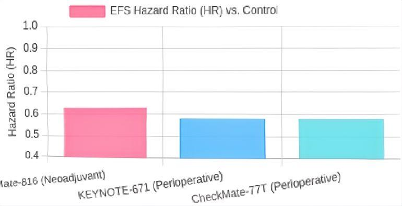 圖中HR展示了部分關(guān)鍵臨床試驗(yàn)中,實(shí)驗(yàn)組(含免疫治療)相對(duì)于對(duì)照組(多為單純化療)的EFS風(fēng)險(xiǎn)比。較低的HR值意味著實(shí)驗(yàn)組的EFS獲益更優(yōu)。