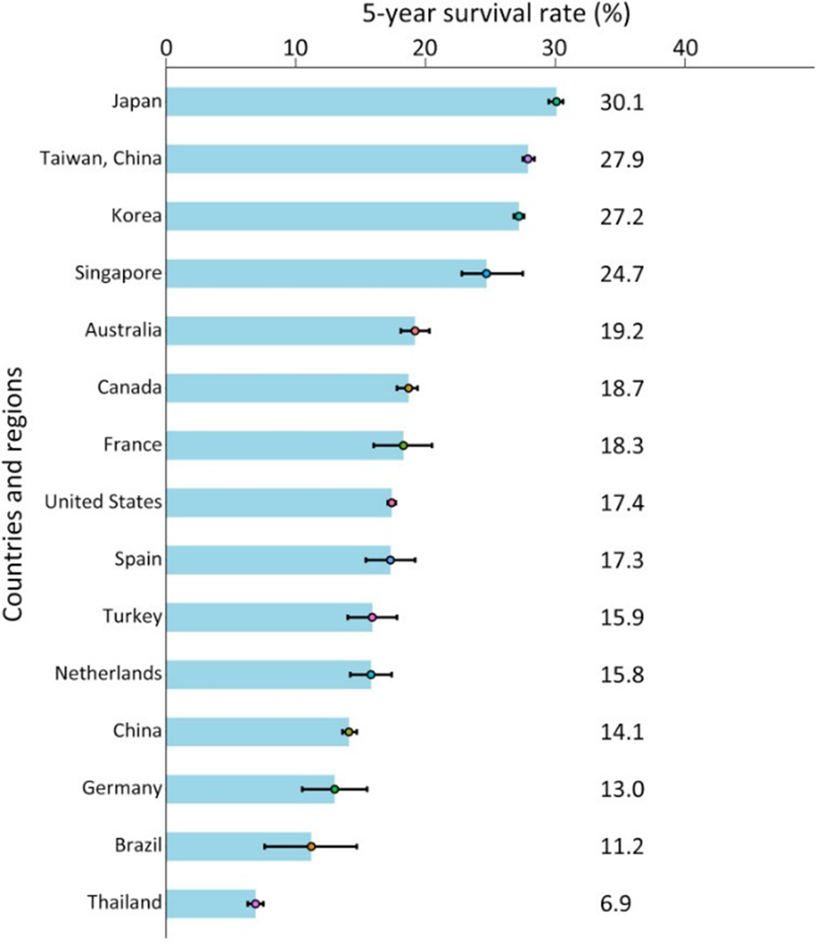 圖1.各國及各地區(qū)肝癌患者的5年生存率