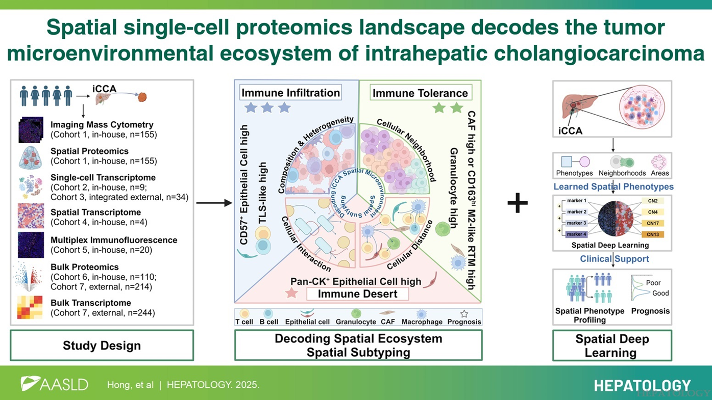 2025 年《HEPATOLOGY》雜志發(fā)表的空間單細(xì)胞蛋白組學(xué)研究,首次繪制了肝內(nèi)膽管癌(ICC)的腫瘤微環(huán)境圖譜。研究發(fā)現(xiàn),CD163+M2型巨噬細(xì)胞富集的患者預(yù)后最差,而三級淋巴結(jié)構(gòu)(TLS)高浸潤者更可能從免疫治療獲益。這一發(fā)現(xiàn)為 ICC的個(gè)體化治療奠定基礎(chǔ),未來通過AI輔助的空間組學(xué)分析,有望實(shí)現(xiàn) "一人一策" 的精準(zhǔn)診療[7]。