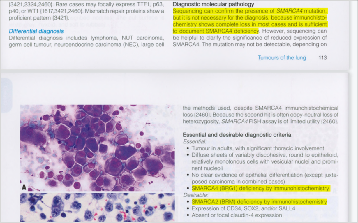 關(guān)于SMARCA4(BRG1)基因突變和蛋白表達(dá),在WHO胸部腫瘤分類指南中在該癌種的診斷分子病理部分這樣提及:基因測(cè)序可以證實(shí)SMARCA4突變的存在,但由于免疫組化檢測(cè)在大多數(shù)情況下能夠顯示SMARCA4蛋白全部缺失,進(jìn)而能夠確診SMARCA4缺陷型腫瘤,基因測(cè)序在診斷上并非必須的。
