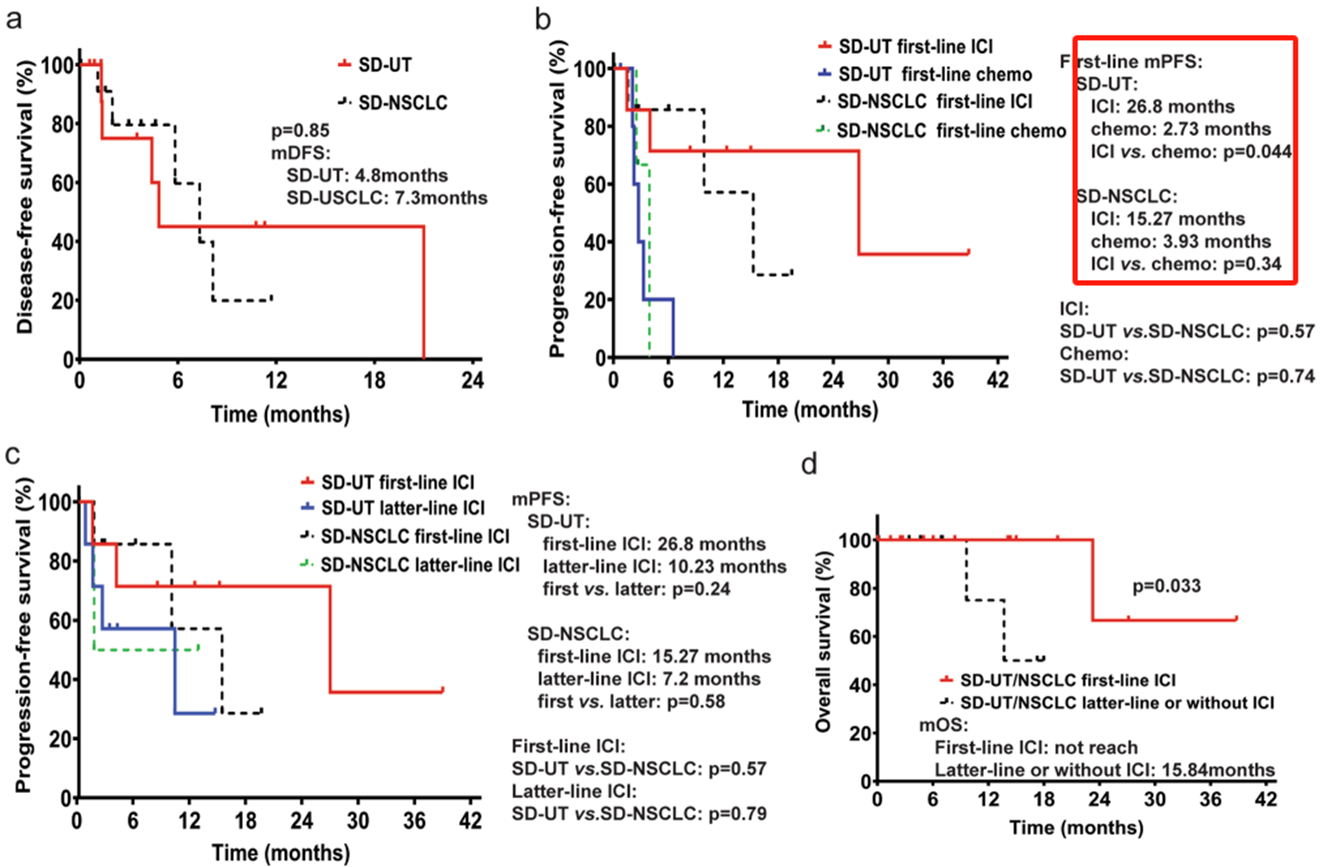 另外,患者一線使用免疫治療的總生存期要顯著高于后線免疫或者非免疫治療的患者(未達(dá)到 vs 15.84月,P=0.033)。表明SMARCA4缺陷型腫瘤應(yīng)盡早使用免疫為基礎(chǔ)的治療方案[5]。